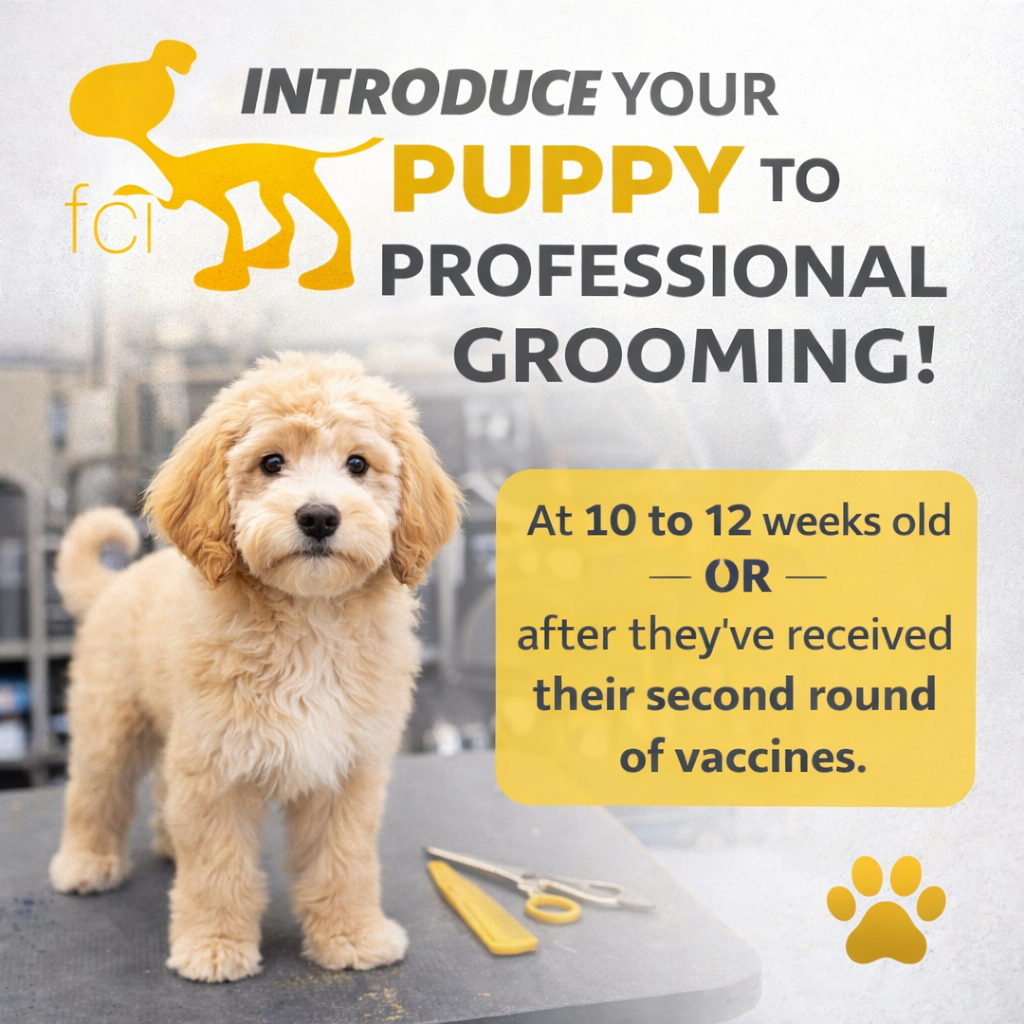 A puppy should be introduced to the salon environment soon after their final vaccinations, at 10 to 12 weeks of age. Leaving this important step beyond 16 weeks may lead to behaviour issues later.